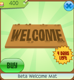 The beta welcome mat is a non member den item. The beta mat is a simple rectangular mat that is light brown with the word welcome printed across it in dark brown. It was originally released in the beta testing at jam mart furniture for 75 gems. It returned for a second release during july 2018.